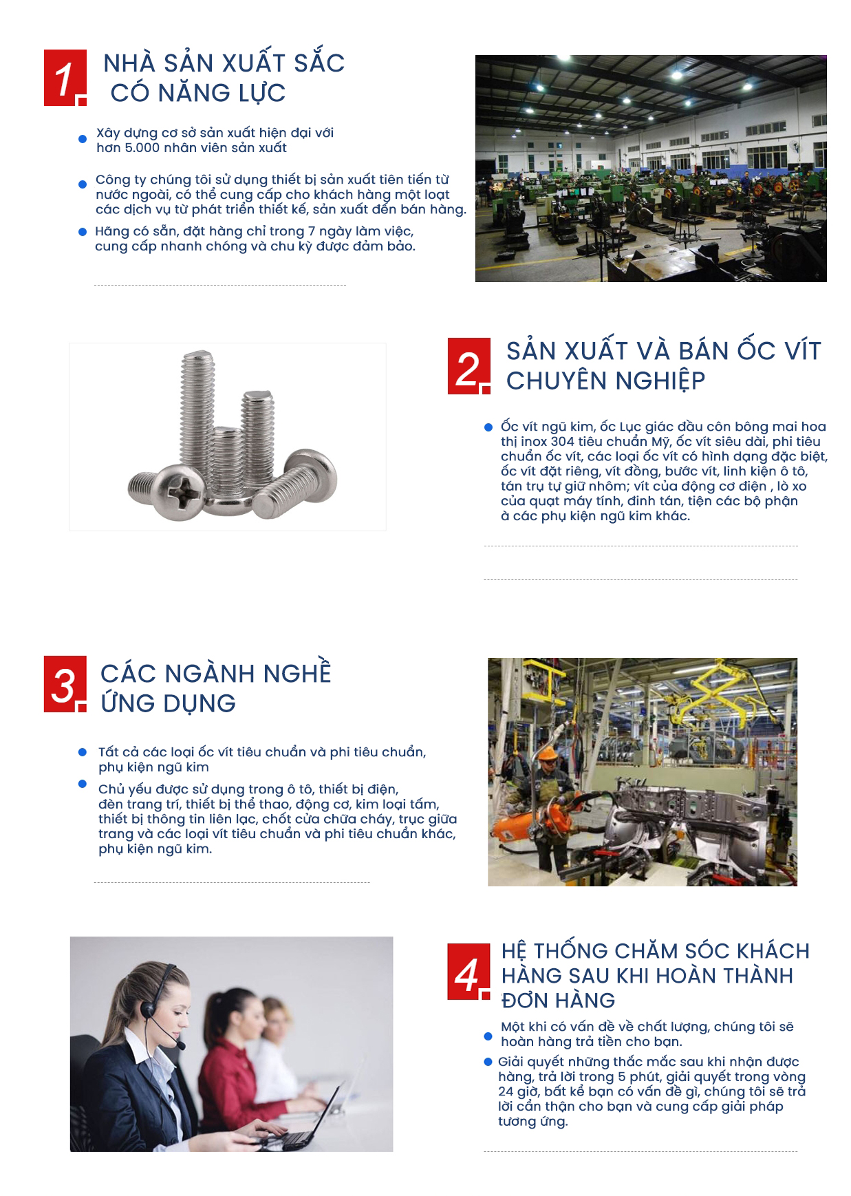 Công Ty Tnhh Sản Xuất Ngũ Kim Hải Phú Đạt Việt Nam chủ yếu sản xuất buôn bán ốc vít, đai ốc, Ốc Trụ Đồng, miếng đệm cũng như tất cả các loại đai siết inox, đai ốc khóa, đai ốc kích thước lớn, phần ngũ kim máy tiện, dập, đúc và các sản phẩm ngũ kim khác. Các sản phẩm chủ yếu được sử dụng trong điện tử, thiết bị điện, đồ nội thất, đồ chơi, thiết bị y tế, máy móc thiết bị, ô tô và các ngành công nghiệp khác. Chúng được xuất khẩu sang các nước phát triển ở châu Âu và Hoa Kỳ. Chất lượng vượt trội và được nhiều khách hàng tin tưởng . Công ty chúng tôi có hệ thống quản lý chất lượng hoàn chỉnh, khoa học. Tuân thủ nguyên tắc đối xử chân thành, phát triển cùng có lợi, công ty chúng tôi tập trung các nguồn lực lợi thế của ngành công nghiệp với mục đích "trung thực, chuyên nghiệp và sáng tạo"; Dịch vụ một cửa; Duy trì giá cả cạnh tranh; Chất lượng sản phẩm ổn định; Mức độ dịch vụ hiệu quả cao. Hoan nghênh khách hàng đàm phán hợp đồng , cùng nhau phát triển. Tiêu chuẩn phạm vi kinh doanh: Tiêu chuẩn quốc gia, Tiêu chuẩn Đức, Tiêu chuẩn Mỹ, Tiêu chuẩn Nhật Bản .Chất lượng sắt: sắt, cường độ cao, inox, đồng, nhôm, thép hợp kim, các mặt hàng vật liệu đặc biệt: bu lông lục giác bên ngoài, bu lông lục giác bên trong, vít tự khai thác, dây máy, đai ốc, đệm phẳng, đệm đạn...